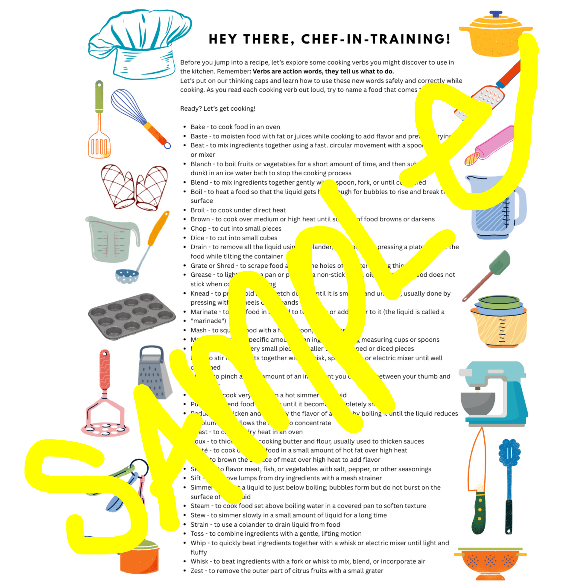 Designed as a beginner-friendly cooking and baking glossary, this reference sheet features clear, simple definitions of common kitchen terms like whisk, fold, sauté, dice, and knead…all explained in kid-friendly language.